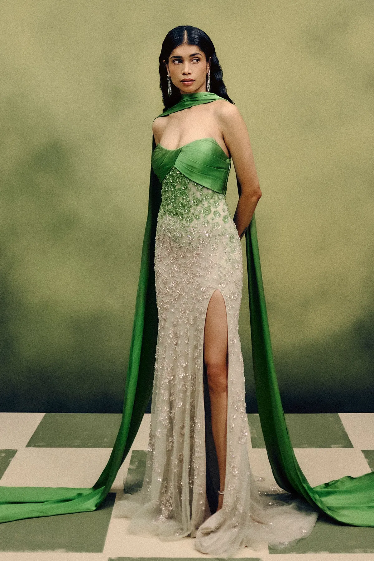 This jade green gown channels contemporary couture elegance with its structured bodice and fluid satin drape that cascades into a sweeping trail. The fitted silhouette transitions into an ivory-toned base, intricately hand-embroidered with crystals and sequins that shimmer with understated brilliance. A thigh-high slit lends a touch of sensuality, while the elongated scarf detail evokes effortless sophistication. A masterful blend of structure, softness, and artistry, this gown is designed for the modern woman of quiet power and timeless grace.