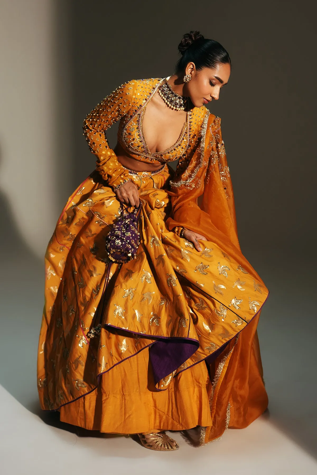 A luminous marigold lehenga adorned with intricate gold motifs that shimmer across the voluminous skirt. Paired with a sculpted, embellished blouse and finished with a fluid dupatta, the ensemble brings together richness and movement in a bold yet refined silhouette. Designed to make a striking statement with effortless elegance.