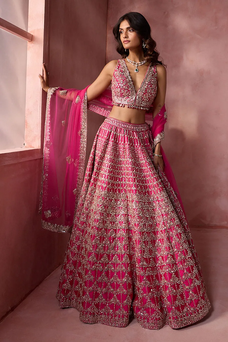 This lehenga is crafted in a vibrant fuchsia pink, richly adorned with dense metallic embroidery and intricate sequin work that creates a striking, high-impact finish. The sculpted blouse is detailed with coordinated embellishments, while the flowing skirt adds volume and grandeur. Paired with a sheer dupatta edged in ornate detailing, the ensemble delivers a bold yet refined silhouette designed to stand out with confidence.