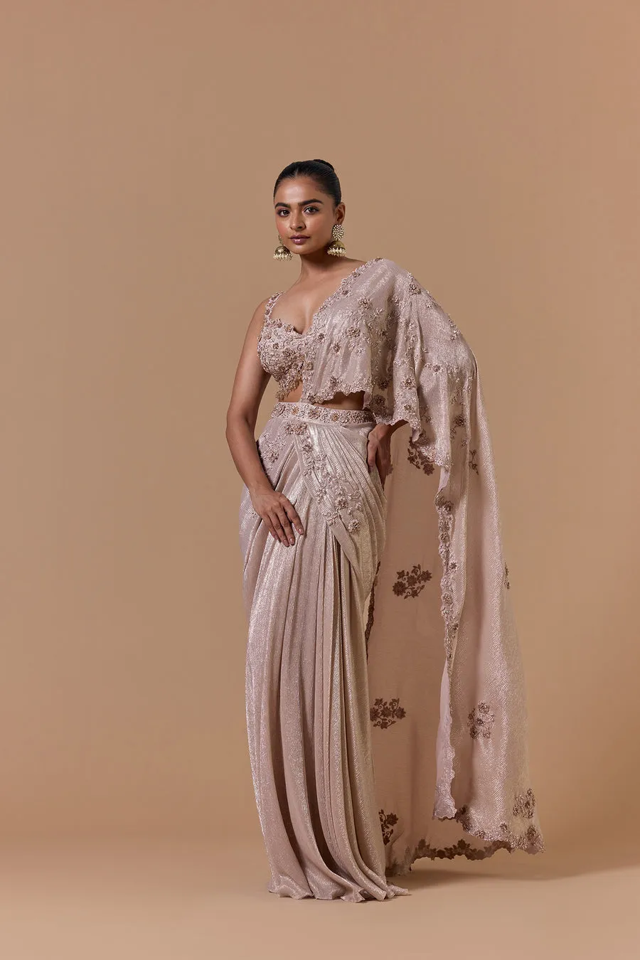 This soft champagne sari is crafted in a subtly shimmering fabric that drapes fluidly for an elegant, elongated silhouette. The sari is detailed with delicate embroidery and fine embellishments along the borders and pleats, adding refined texture without overwhelming the design. Paired with a coordinated embellished blouse and a softly detailed pallu, the ensemble balances modern sophistication with timeless grace.