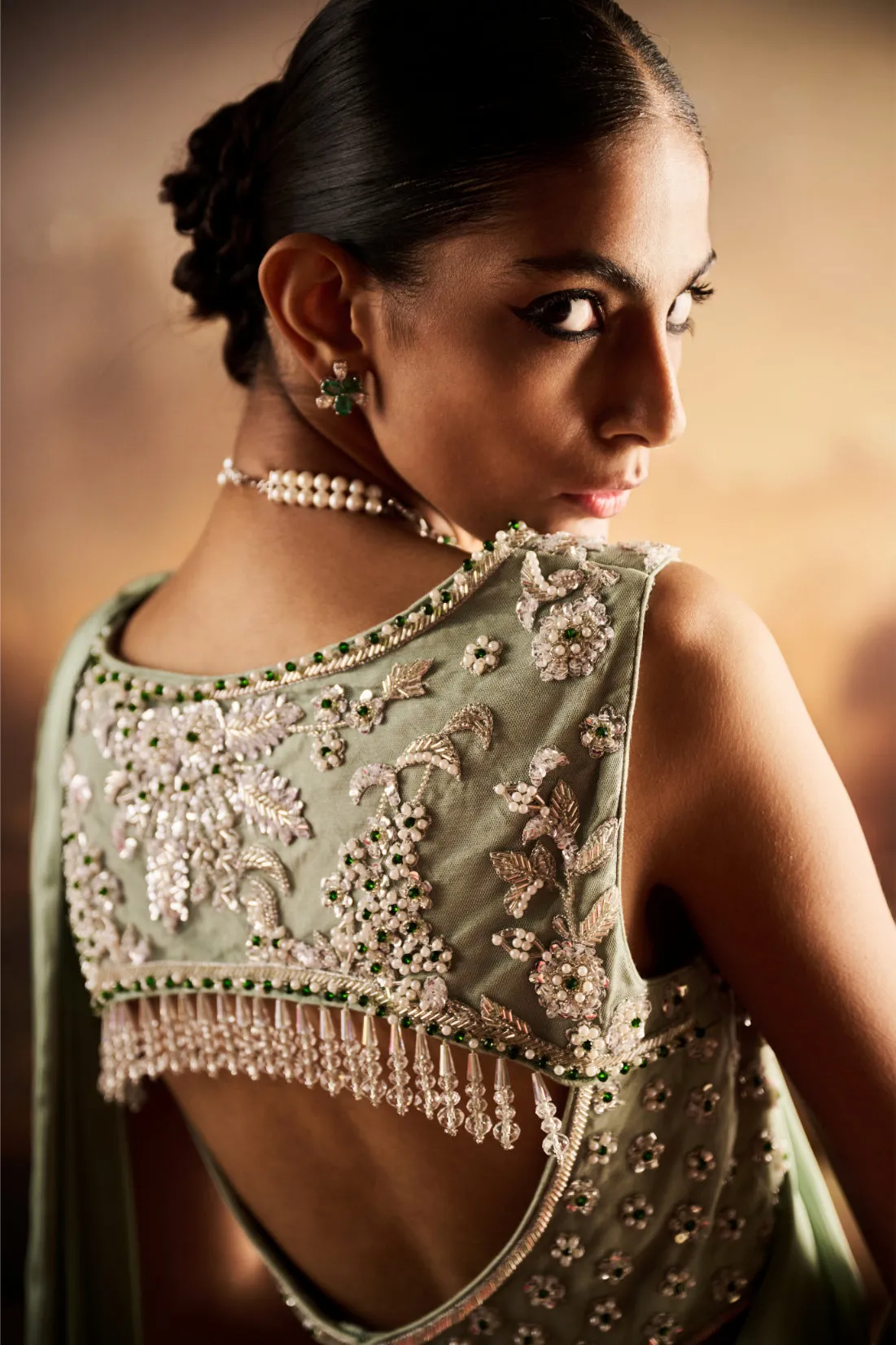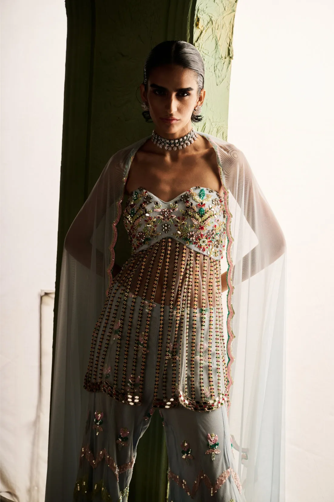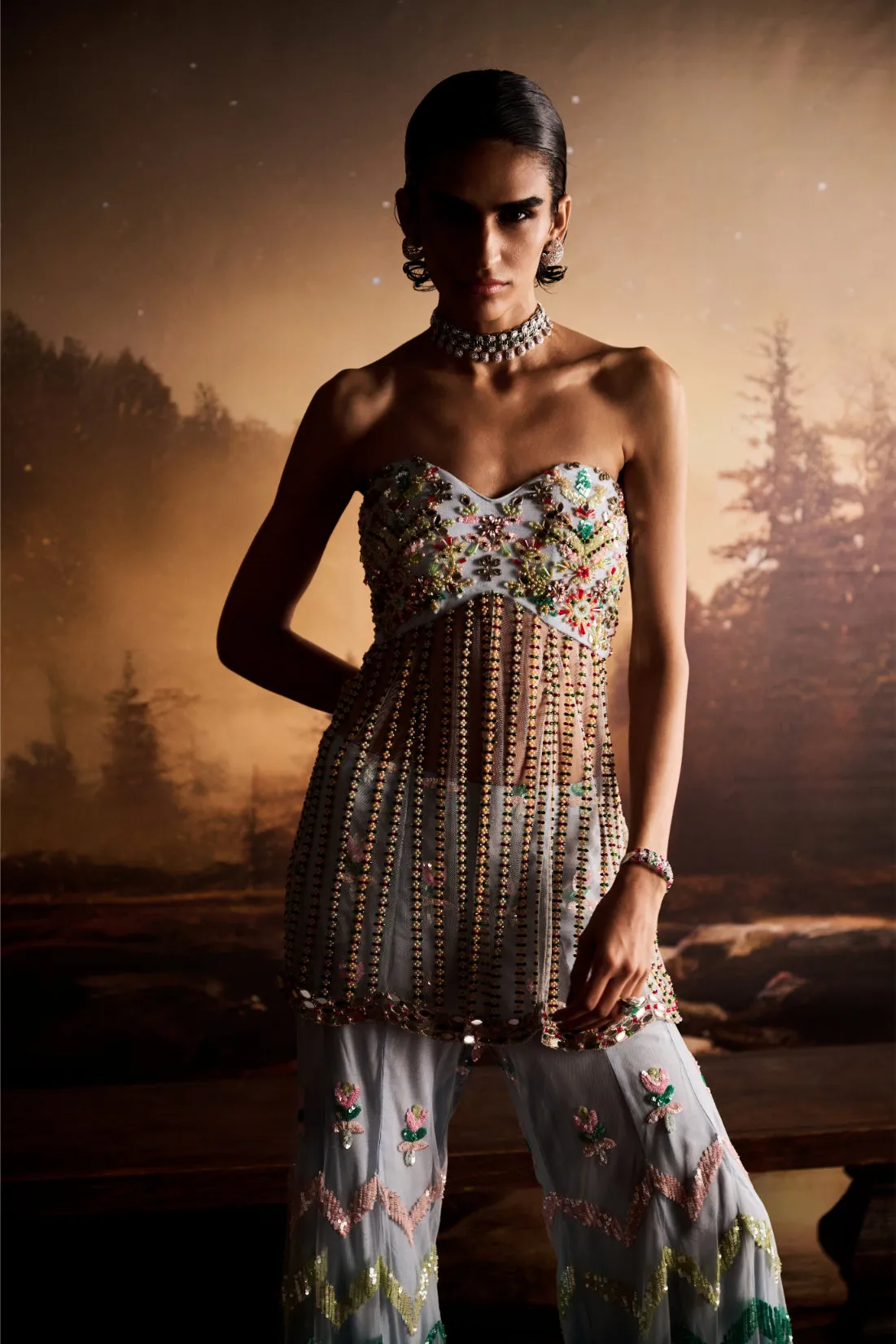 A contemporary twist on tradition, this pastel sharara set features a strapless corset-style kurta embellished with intricate beadwork and floral detailing. Paired with flared sharara pants in sheer fabric, showcasing multicolor chevron embroidery and sequins, the look is playful yet elegant — perfect for standing out in style.