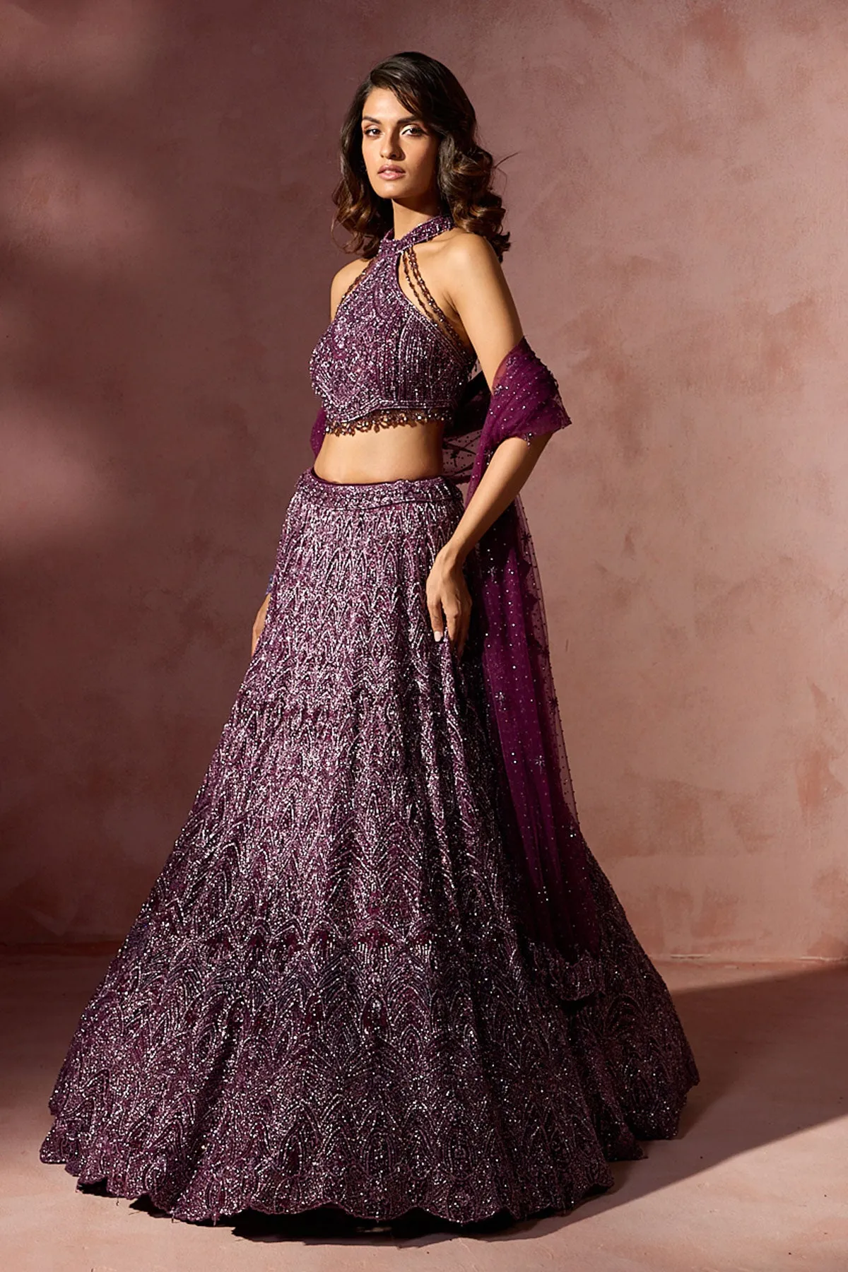 This molten gold lehenga is a radiant ode to high couture glamour, illuminated with cascading linear sequin embellishment that moves fluidly with every step. The sculpted blouse is richly adorned with intricate handwork and layered chain detailing, lending a sensuous yet refined dimension to the silhouette. The interplay of warm metallic tones and ornate craftsmanship creates a look that is both commanding and exquisitely polished. Designed to captivate under evening lights, this ensemble embodies unapologetic luxury and timeless opulence.
