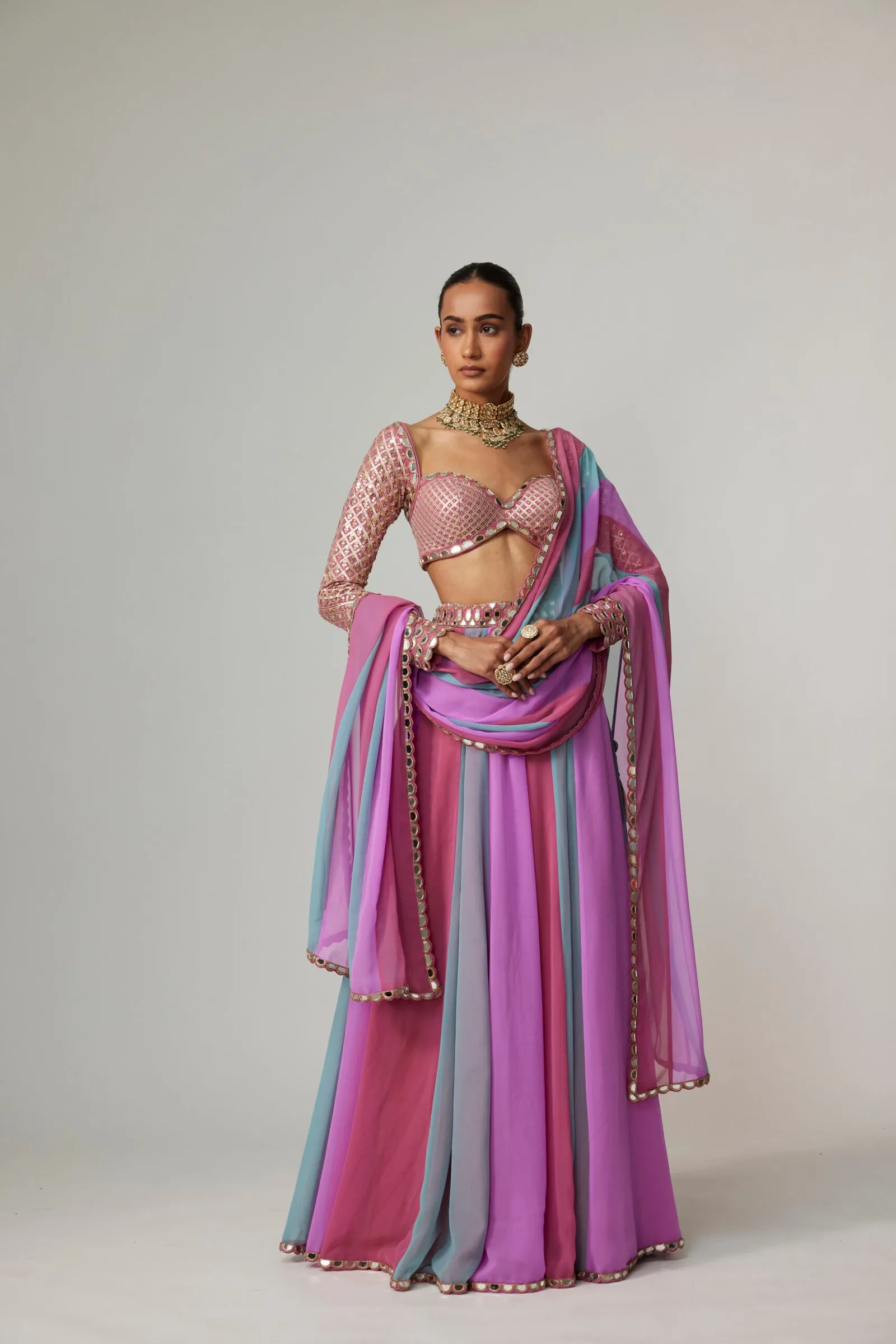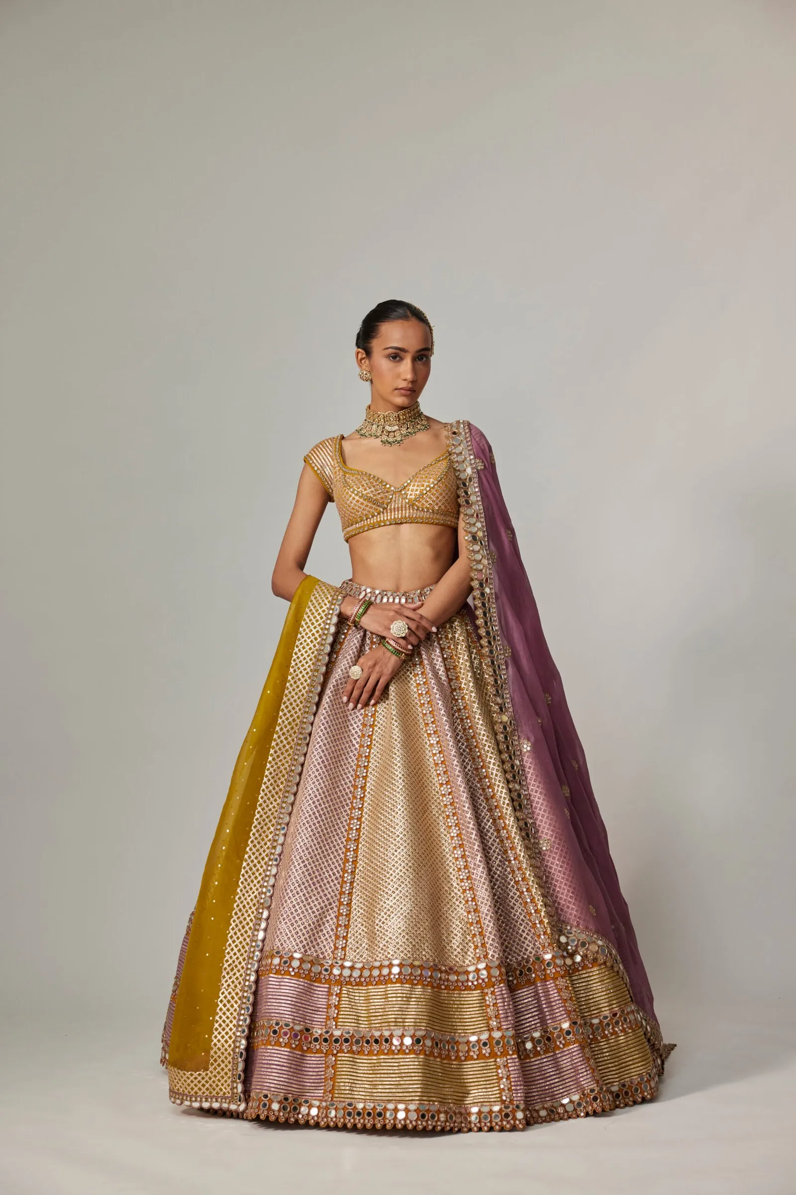 A vivid lehenga designed with alternating mustard and lilac panels, exuding contemporary vibrance and festive charm. The deep V-neck mirror work blouse adds a touch of shimmer, while the mustard dupatta edged with mirror embellishments ties the look together. Delicate tassels at the waistline bring playful movement to this radiant ensemble.